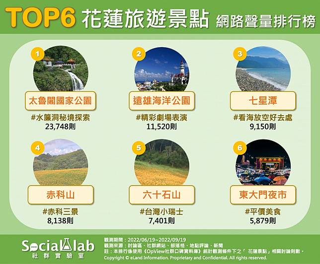 《Social Lab社群實驗室》本次透過《OpView社群口碑資料庫》追蹤近三個月內「花蓮景點」話題的網路聲量表現,帶您了解有關網友熱議的花蓮六大旅遊景點排行。