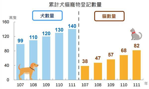 民眾飼養寵物的類型多元,兔子、鼠、鳥、昆蟲等也頗為常見,但犬貓為國人常見寵物類型,根據農委會寵物登記統計,去年底犬貓合計登記數量達到222萬隻,其中犬有140萬隻、貓為82萬隻。